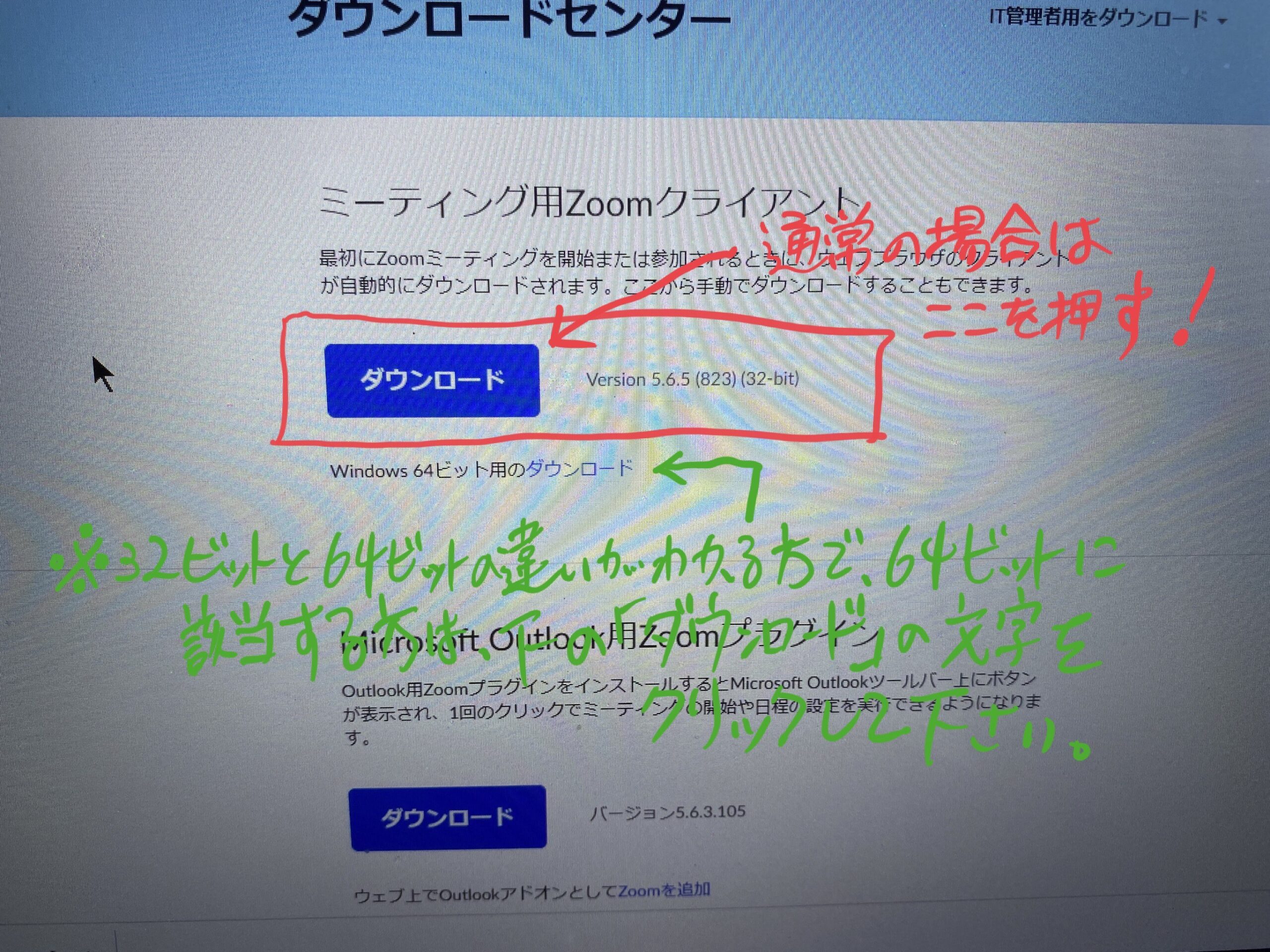 (32ビットと64ビットの違いがわかる方で、64ビットパソコンに該当する方は、ボタンではなく文字として「ダウンロード」と書いてある文字を押してダウンロード作業を進めてください。通常の場合は、青いボタンを押せば大丈夫です。)