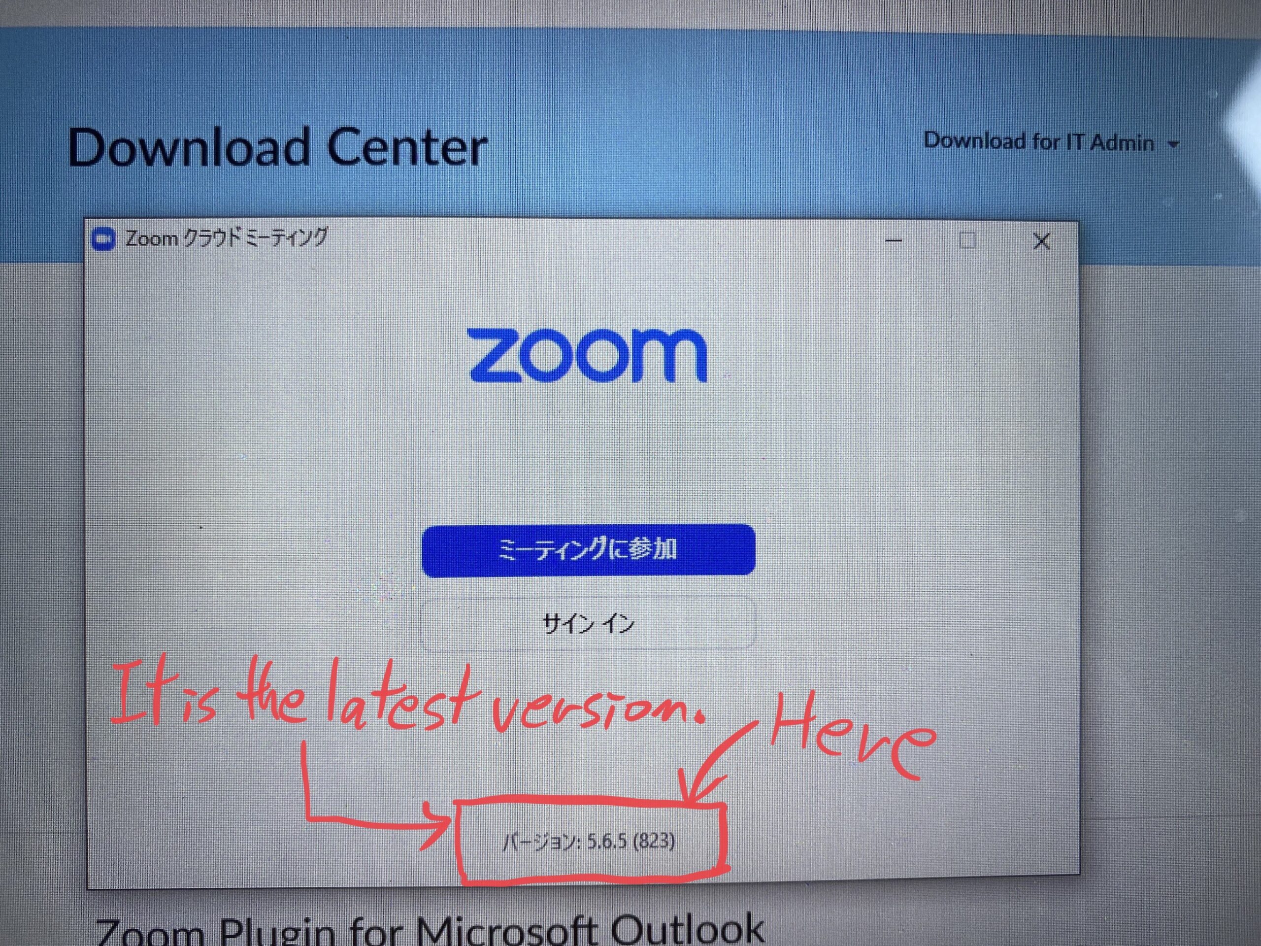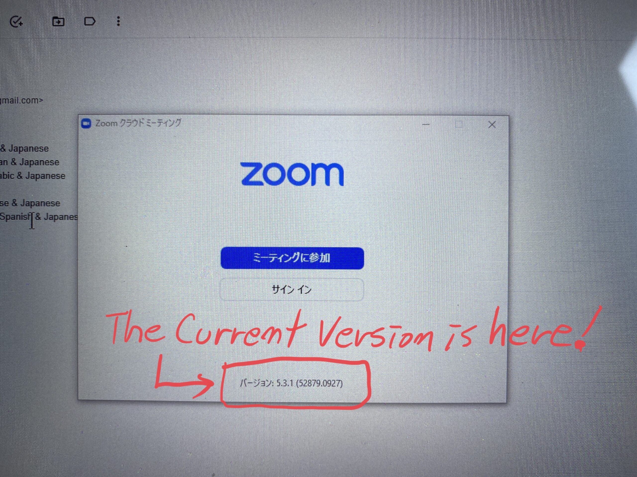 Zoomアプリを開いてすぐの画面で、一番下のバージョンを見て、『5.6.5』と表示されていれば、Zoomアプリのアップデート(更新)は完了です。